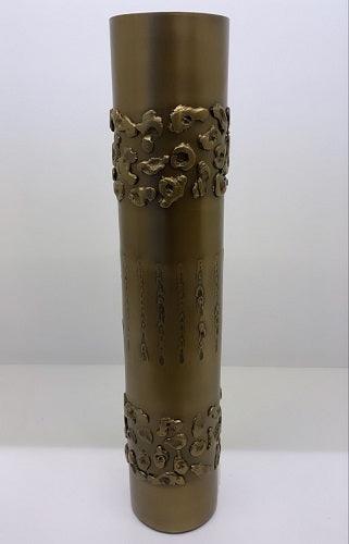 Iron cylindrical vases an antique brass metal finish are detailed with textured cuffs. Available in Large, Medium & Small. Prices mentioned are for 1 Quantity of the size mentioned above. If you want to add other sizes please check on the website for availability or contact us